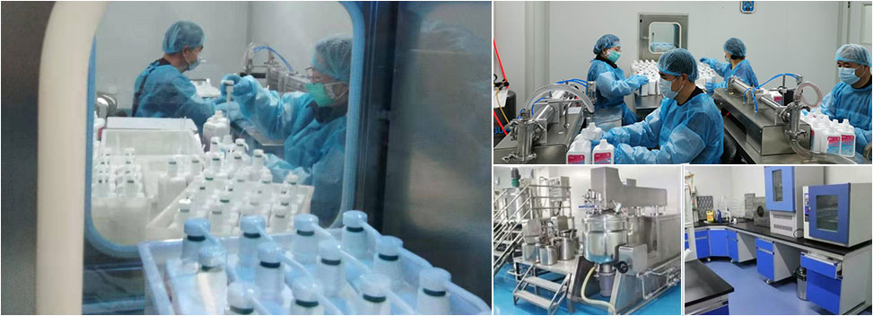 十万等级洁净度进化车间,先进的仪器设备,搅拌机、均质机、储液罐、数控液体灌装机、电子喷码及、电感应封口机等成套设备,安全可靠的研发生产工序以及全套可视化生产系统,车间采用人机交换技术,检测技术实时记录、产品质量得到严格把控,真正做到产能、质量双确保。